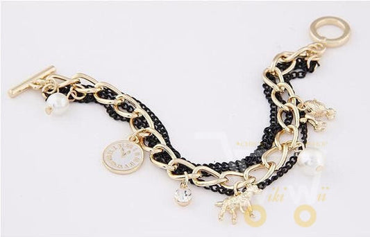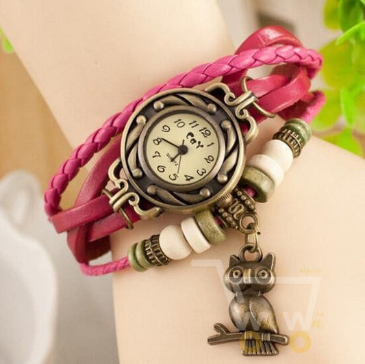 Bronze Ladies Quartz Owl Wooden Bead Bracelet Clock With 8 Colors